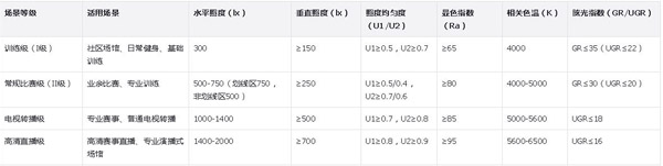 结合《全民健身场地体育照明设计及使用要求》与国际羽联标准,按使用场景分为四级,明确各场景核心照明参数,确保方案针对性与专业性,具体参数如下表所示: